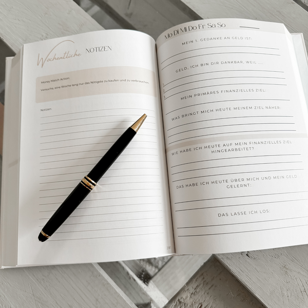 Ein Journal, um täglich aufzuschreiben, wofür du dankbar bist, was du an Geld magst und welche finanziellen Ziele du täglich verfolgen willst. Das Ausfüllen dauert täglich maximal bis 6 Minuten. Einmal morgens und einmal abends. Auf den ersten 8 Seiten findest du Infos zu finanzieller Fülle und wie du am Ball bleibst. Forschungsergebnisse zeigen, dass Menschen, die ihren Tag mit finanzieller Achtsamkeit beginnen, eine höhere Lebenszufriedenheit, mehr Erfolg und eine positive Einstellung zu Geldangelegenheiten entwickeln. Durch das tägliche Praktizieren von finanzieller Selbstfürsorge und Dankbarkeit für das, was man hat, fördert man nicht nur ein gesundes Verhältnis zu Geld, sondern konzentriert sich auch auf die Aspekte des Lebens, die finanziell gut laufen. Dieses Geldjournal ist das ideale Werkzeug, um finanzielle Selbstliebe, Dankbarkeit und positive finanzielle Affirmationen miteinander zu verknüpfen. Diese drei Schlüsselelemente werden deine finanzielle Einstellung und dein Wohlbefinden nachhaltig zum Positiven verändern.